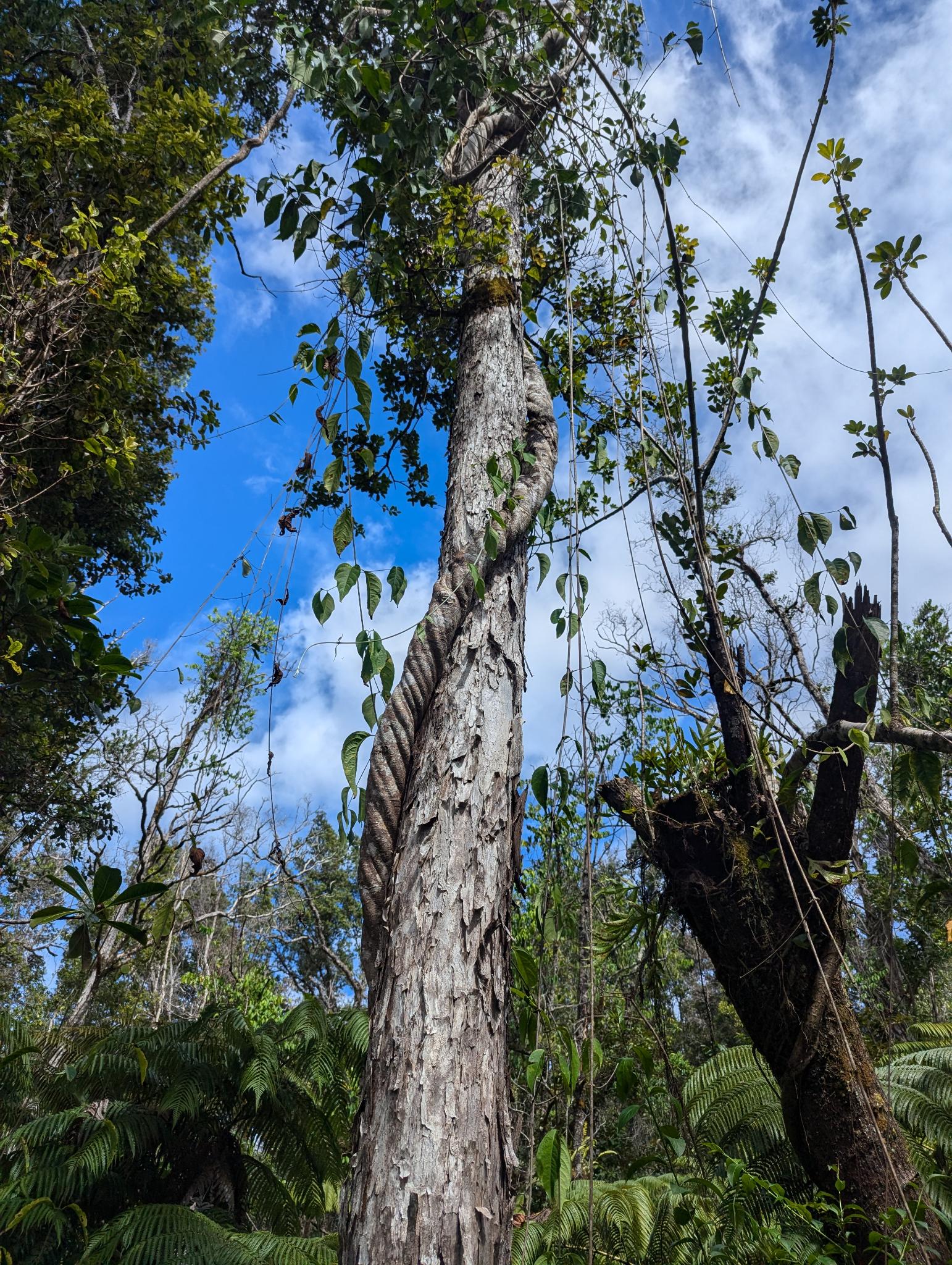 This is a photo of our caapi clone at Botanical Dimensions in Hawaii, which was taken in November 2024. It is about the thickness of a human thigh.