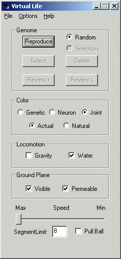 Water - If the Water box is checked, water will be turned on, if not, water will be turned off. If water is on, movements of the body parts of the creature will create an opposing force, fluid drag. This can permit swimming. The viscosity of the water can be altered through the Options-Miscellaneous menu.