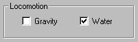 The kind of locomotion available to the creature is determined indirectly, by the kind of physics simulated in the environment. This is affected by the controls over the presence or absence of gravity and water, and by whether the ground plane is permeable (see next section). If water is present, the creature experiences fluid drag when moving, and this can make it possible to swim. If gravity is present, and the ground plane is impermeable, the creature will fall onto the ground plane where its movements will cause friction. The friction of body parts moving on the ground plane can cause the creature to crawl across the ground (regardless of whether the ground is visible). If both water and gravity are turned on, it simulates the bottom of a lake or ocean. The creature may swim or crawl across the ocean floor.