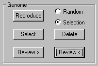 Review > and Review < - If there is more than one creature in memory, you can review them with the Review > and Review < buttons. The difference between the two buttons is that they go through the list in opposite directions. If after viewing several creatures, you remember one that you would like to select for evolution, you can find it with the Review buttons.