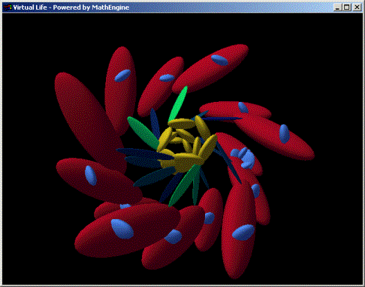 Reproduce – Pressing the Reproduce button the first time creates a new creature, and causes the render window to open displaying the animated creature. Reproduce is the button you will use the most. The behavior of this button depends on the radio-buttons to the right of the Reproduce button. The render window is shown below: