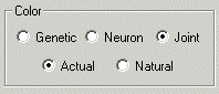 Natural - If the Joint-Natural radio-button is selected, the color of the boxes will reflect the natural angles on the joint at any time. The natural angles are the direct output of the joint angle actuators of the nervous system and can change wildly from moment to moment. For this reason, this setting can cause wild changes in color.