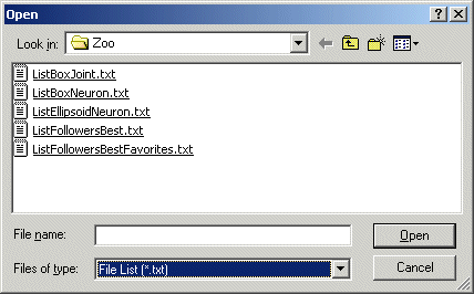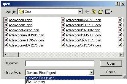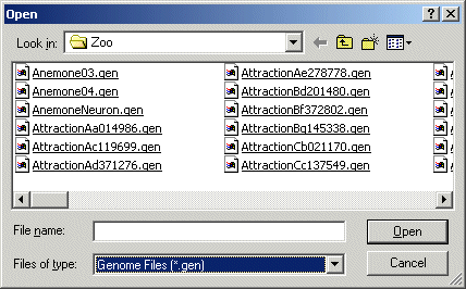 The File menu provides the means of reading genomes from the Zoo, and saving genomes in the Zoo. These functions are discussed in some detail under Help-The Zoo. By default, Read will open the Open File-Selection dialog, configured to access only genome files, which have the .gen extension (see below).