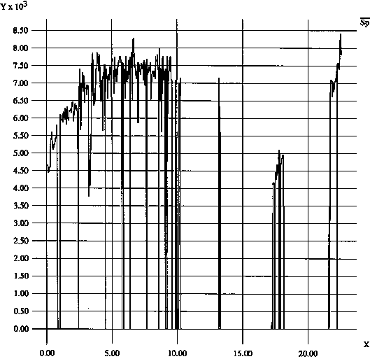 Figure 6 - Variation of Speed on One Node. The horizontal axis shows time in hours. The vertical axis shows speed in instructions per second. The Speed drops to zero when the user is active. This machine was at the Santa Fe Institute.