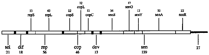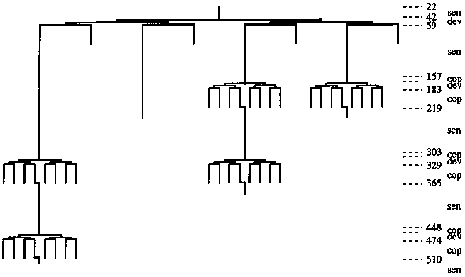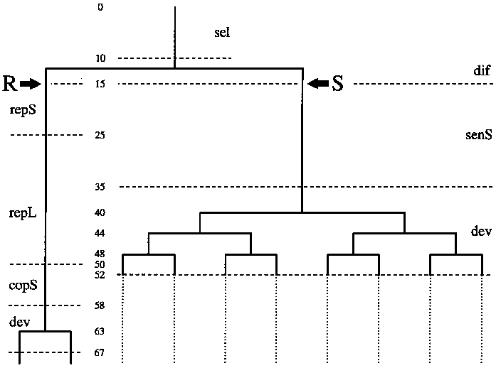 The sel gene is expressed only by the undifferentiated initial cell. The dif gene is expressed only by the initial cell, and the undifferentiated products of its first division. Execution of the dif gene causes the first two cells to differentiate into reproductive and sensory cells (by means of a conditional jump to the rep or sen genes). The rep gene is expressed only by the reproductive tissue, and the sen gene is expressed only by the sensory tissue. The cop and dev genes are expressed by both reproductive and sensory tissues, through a system of gene promotion (procedure calls).