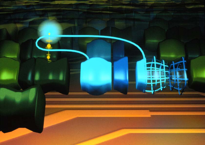 A parasite (blue, two piece object) uses its CPU (blue sphere)