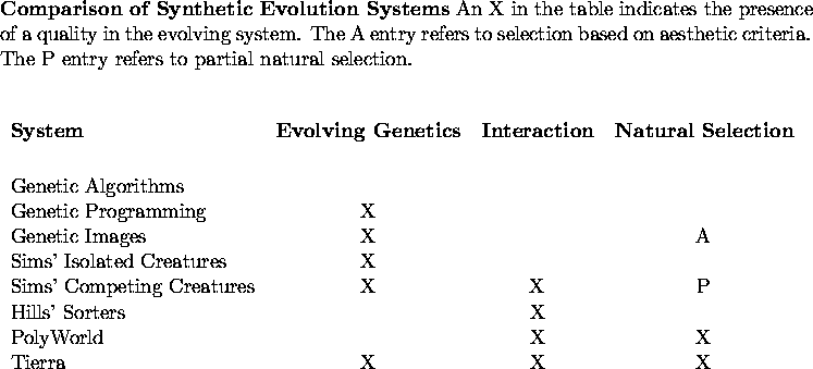 In most systems, selection is determined by an external ``fitness function'' which is fixed and does not change through the course of the simulation. These systems have a blank in the ``Natural Selection'' column. In the Genetic Images system, the selection is determined by the aesthetic whim of the user, indicated by an ``A'' in the table. In the system involving Sims' virtual creatures competing for possession of the block, the external fitness function is fixed: ability to possess the block. However, at the same time, this ability depends in complex ways on the interaction with the other creatures with whom you compete. Therefore we have partial natural selection in this system, indicated by a ``P'' in the table. In a few systems, the selection is completely natural, based only on the ability to survive and reproduce, and is indicated by an X in the Natural Selection column.