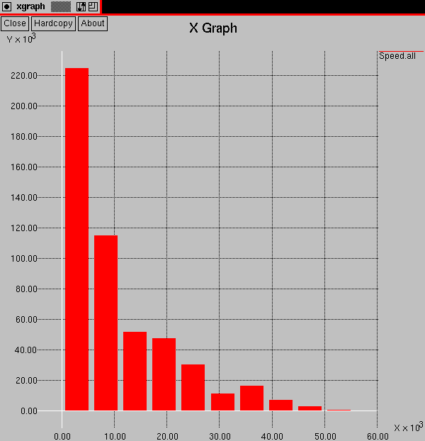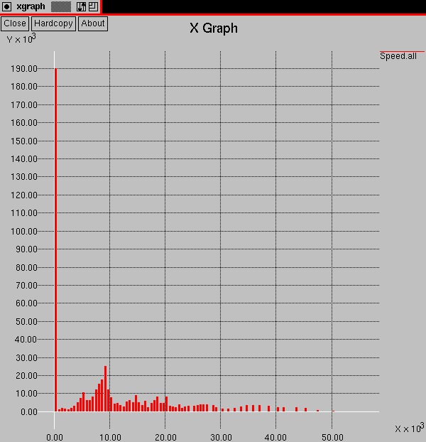 In addition to the high percentage of sleeping nodes, there is also a very wide distribution of (non-zero) CPU speeds. Organisms on fast nodes can reproduce faster than organisms on slow nodes, thus there should be selection to discriminate and migrate to fast nodes. The frequency distribution of the 504,589 values of the Speed data is illustrated in Figures A (sorted into 100 bins) and B (sorted into 10 bins). The horizontal axis is CPU speed in thousands of instructions per second, the vertical axis is frequency in thousands.