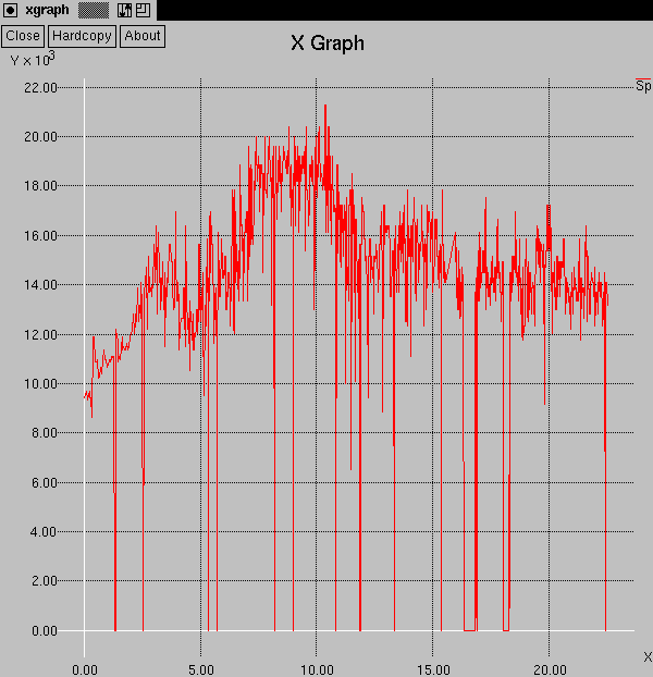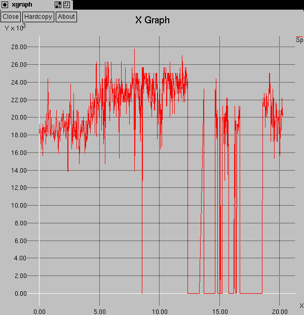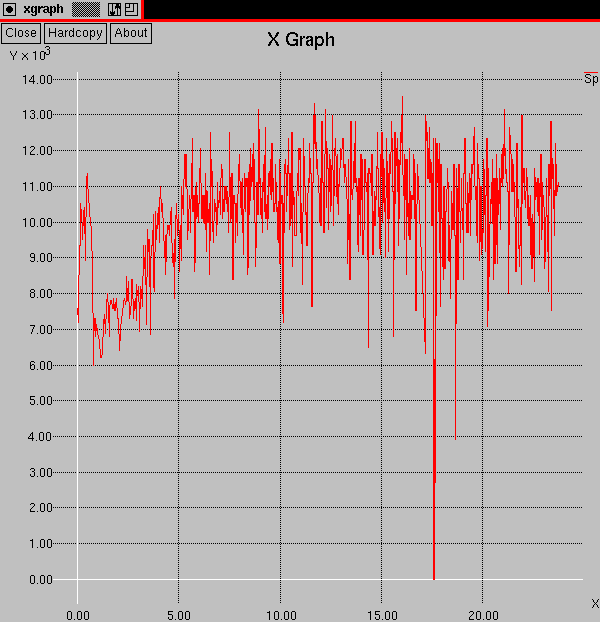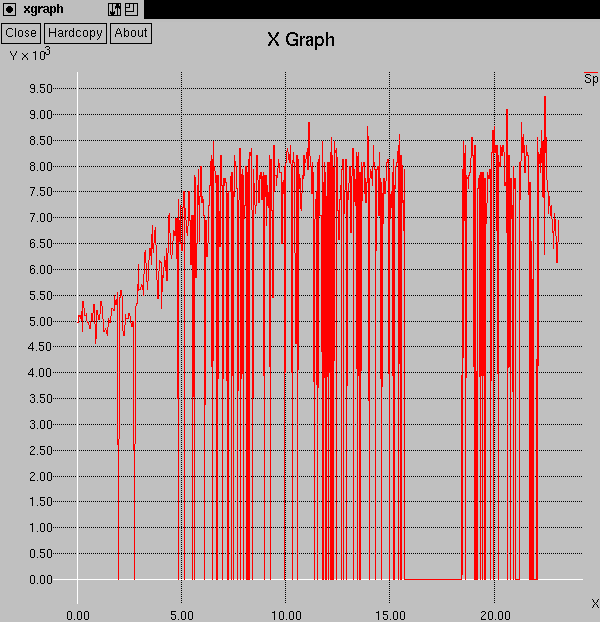 We are expecting the heterogeneity in available CPU cycles to provide selective forces for maintaining cell differentiation. Availability of CPU cycles is reflected in the Speed (virtual instructions per second) field of the TPing data structure. In the December test, we examined the distribution of this variable. Over a 48 hour period, these values were collected after every million instructions executed on our point of view node (at ATR), from all the other nodes on its MapFile. This generated 504,589 values of Speed data, of which 188,594 (37%) were zero values. Zero Speed values indicate that the Tierra process is sleeping on the associated node. If genomes migrate to a sleeping Tierra process, their packets will be lost in the net, and they will die. This should provide a strong selective force for avoiding migration to sleeping nodes.