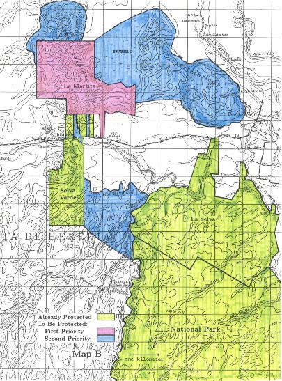 The areas already under protection in the Chilamate area are highlighted in green on map B. The areas proposed for protection are highlighted in blue and pink.
