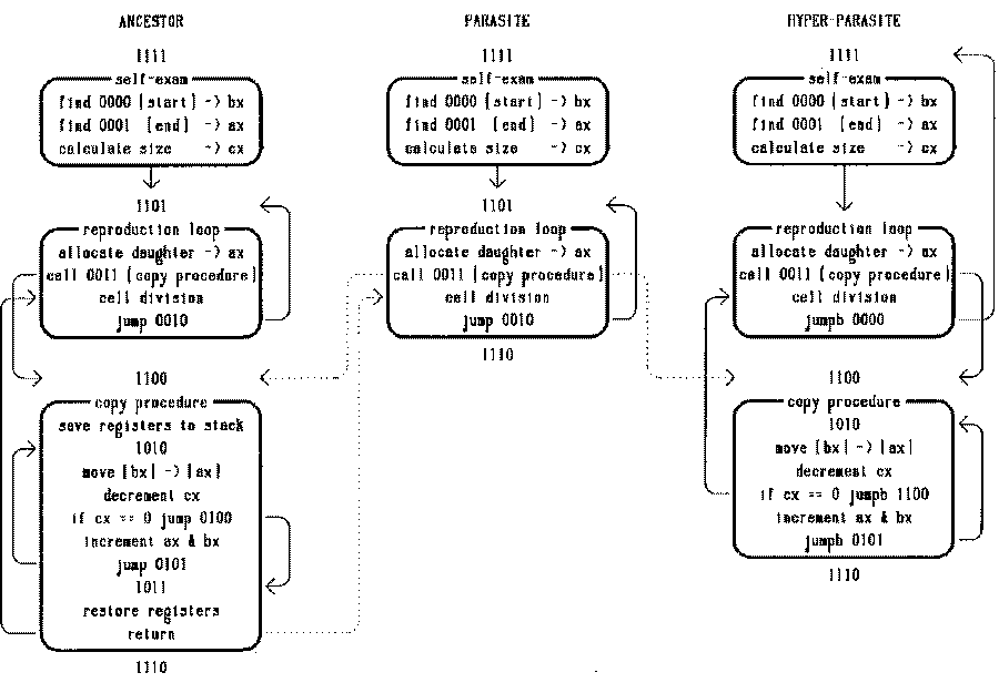 The ancestor examines itself to determine where in memory it begins and ends. The ancestor's beginning is marked with the four no-operation template: 1 1 1 1, and its ending is marked with 1 1 1 0. The ancestor locates its beginning with the five instructions: ADRB, NOP_0, NOP_0, NOP_0, NOP_0. This series of instructions causes the system to search backwards from the ADRB instruction for a template complementary to the four NOP_0 instructions, and to place the address of the complementary template (the beginning) in the ax register of the CPU (see Appendix A). A similar method is used to locate the end.